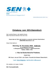 « CSU-SEN-Stammtisch GH Kirschner, Dienstag, 04.11.2025, 19.00 Uhr